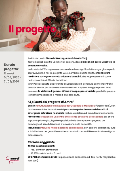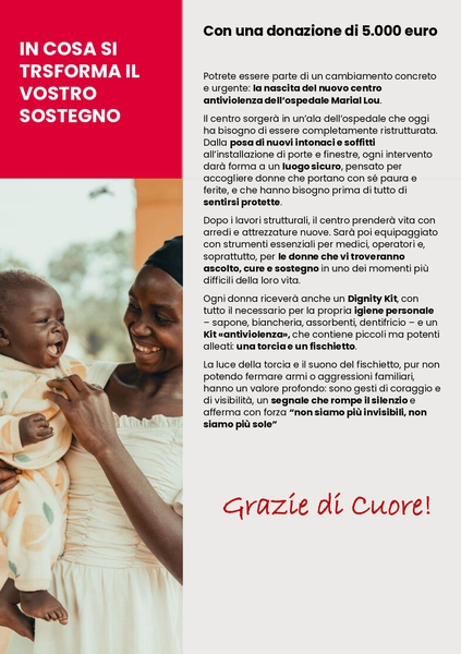 L'associazione si impegna a sostenere le spese del progetto che prevede la ristrutturazione di un Centro Sanitario in Sud Sudan ossia l'Ospedale Marial Lou e al suo interno ci sarà un Centro Antiviolenza a difesa delle donne.